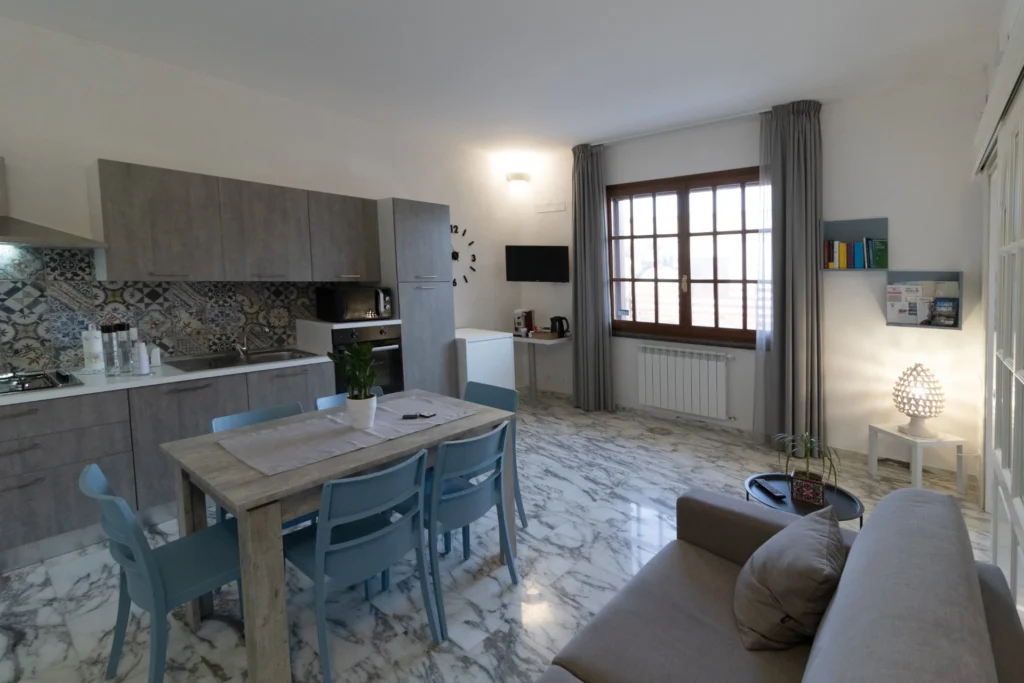 L’alloggio più spazioso della struttura, perfetto per famiglie o piccoli gruppi. Offre ambienti luminosi, arredi funzionali e una splendida vista sugli spazi esterni della villa.