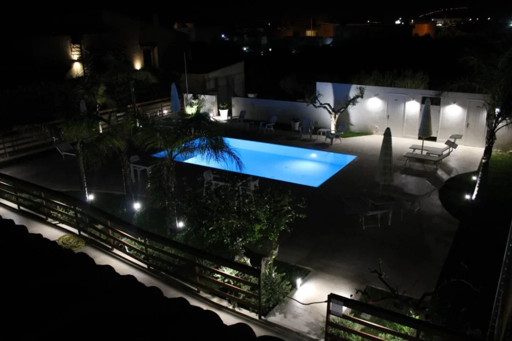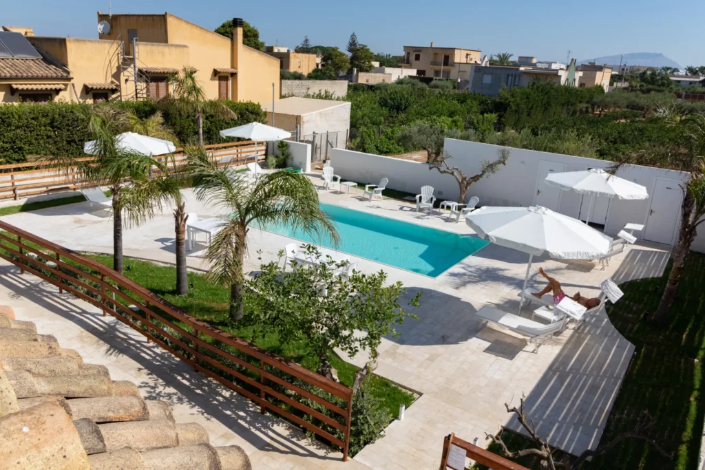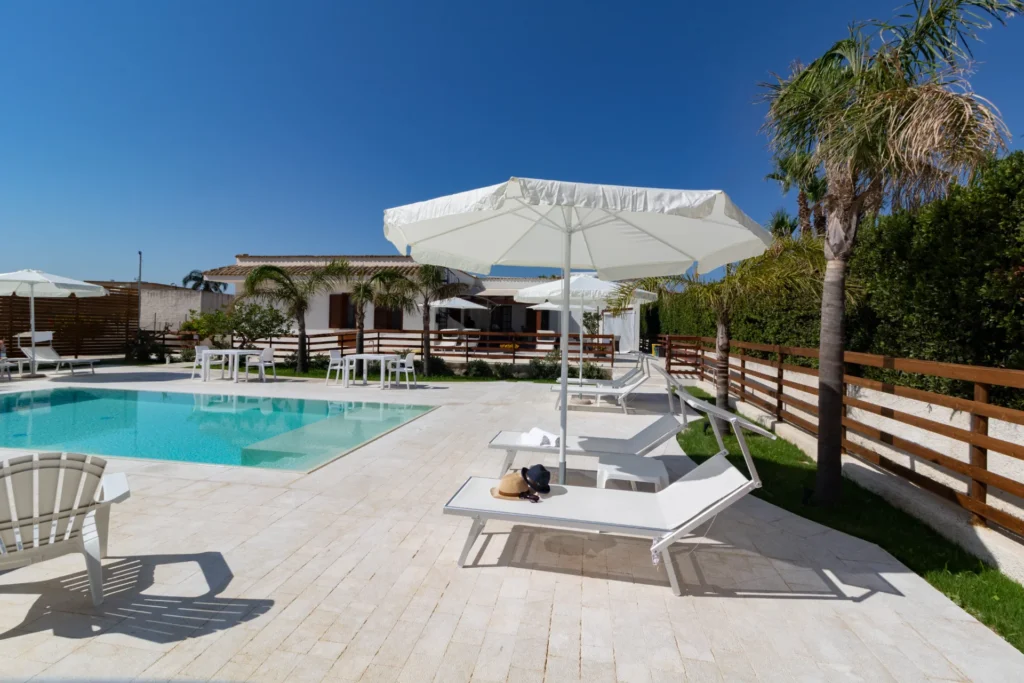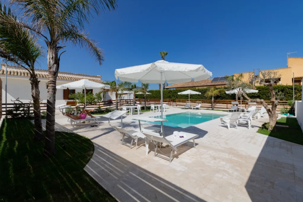 Il vero cuore pulsante della struttura è la splendida piscina a sfioro con acqua salata, incastonata in un giardino curato e silenzioso. Pensata per offrire il massimo del relax, la piscina include una zona ad acqua bassa (ideale per i bambini o per rinfrescarsi in totale sicurezza) ed è circondata da un solarium attrezzato con comodi lettini e ombrelloni. È il luogo perfetto dove rigenerarsi dopo una giornata di escursioni o dove ammirare la luce dorata del tramonto siciliano in totale tranquillità.