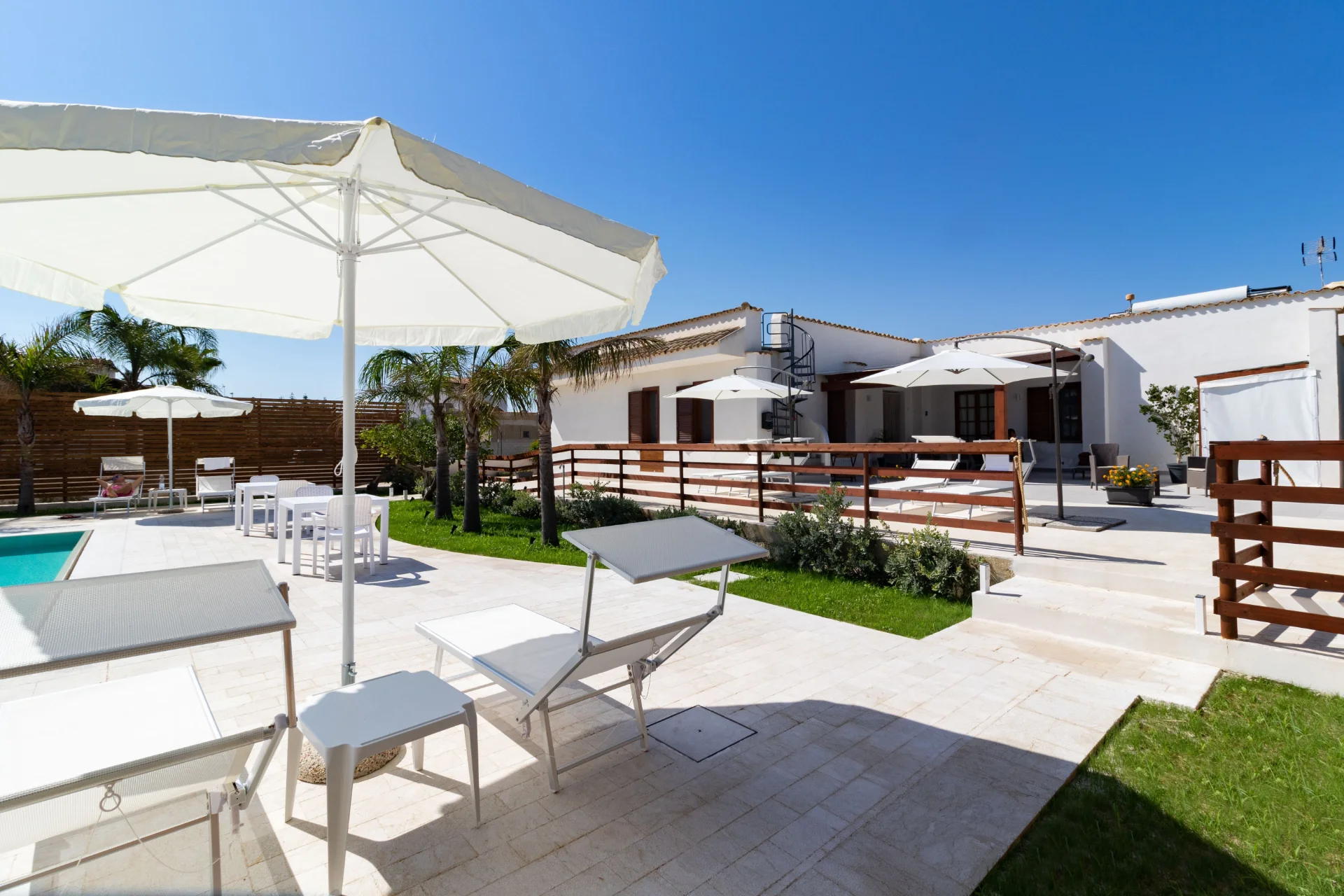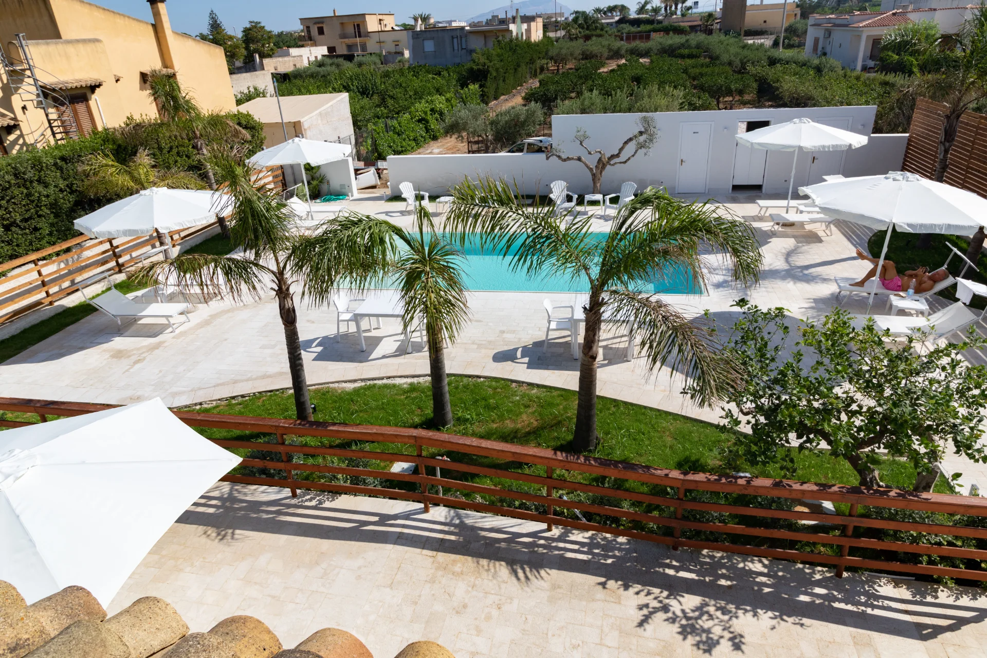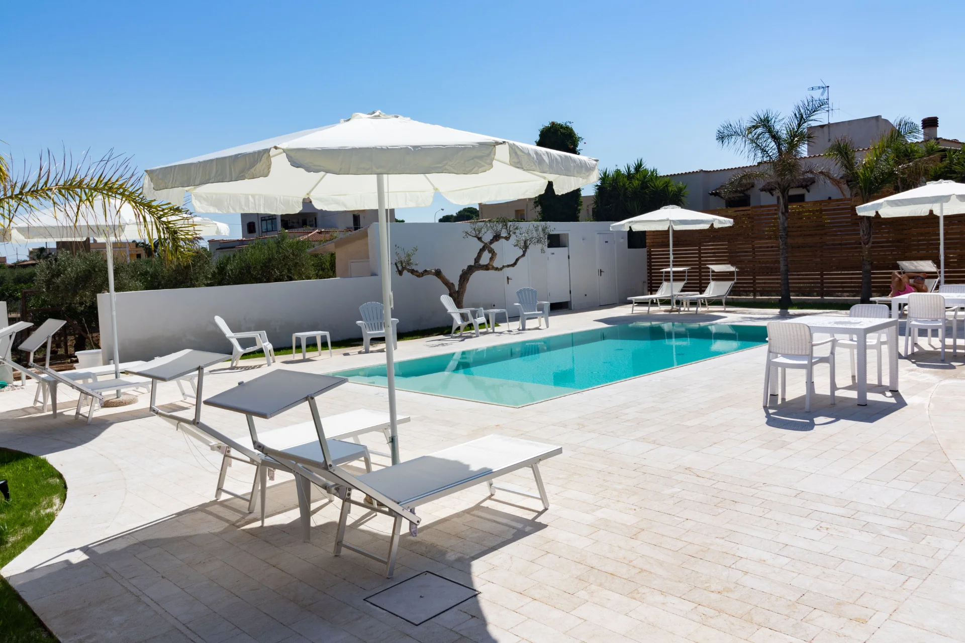 Il vero cuore pulsante della struttura è la splendida piscina a sfioro con acqua salata, incastonata in un giardino curato e silenzioso. Pensata per offrire il massimo del relax, la piscina include una zona ad acqua bassa (ideale per i bambini o per rinfrescarsi in totale sicurezza) ed è circondata da un solarium attrezzato con comodi lettini e ombrelloni. È il luogo perfetto dove rigenerarsi dopo una giornata di escursioni o dove ammirare la luce dorata del tramonto siciliano in totale tranquillità.